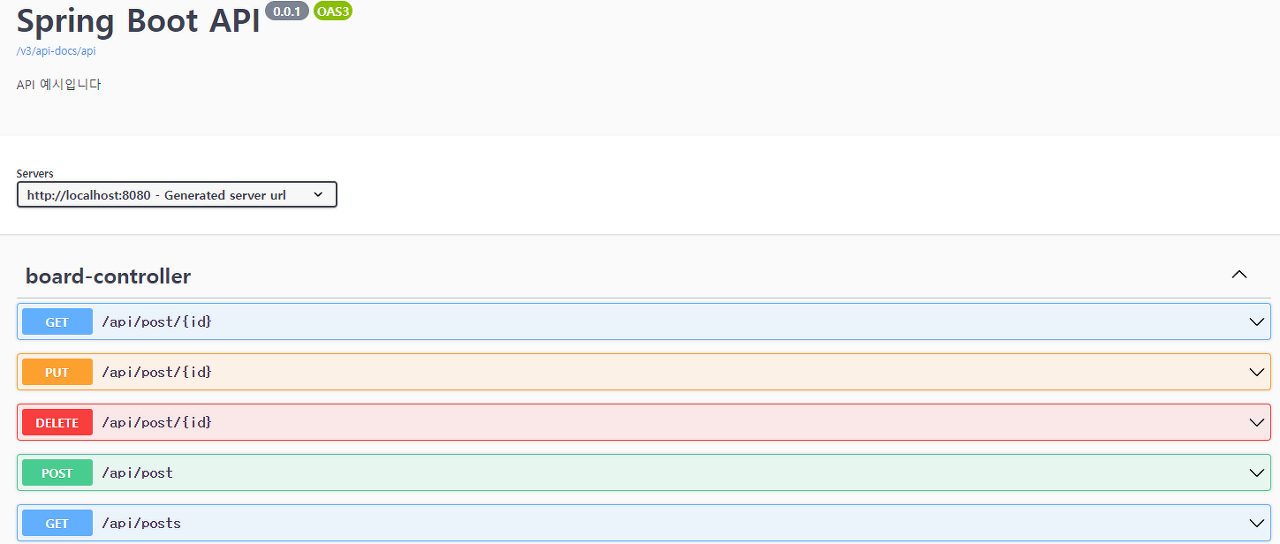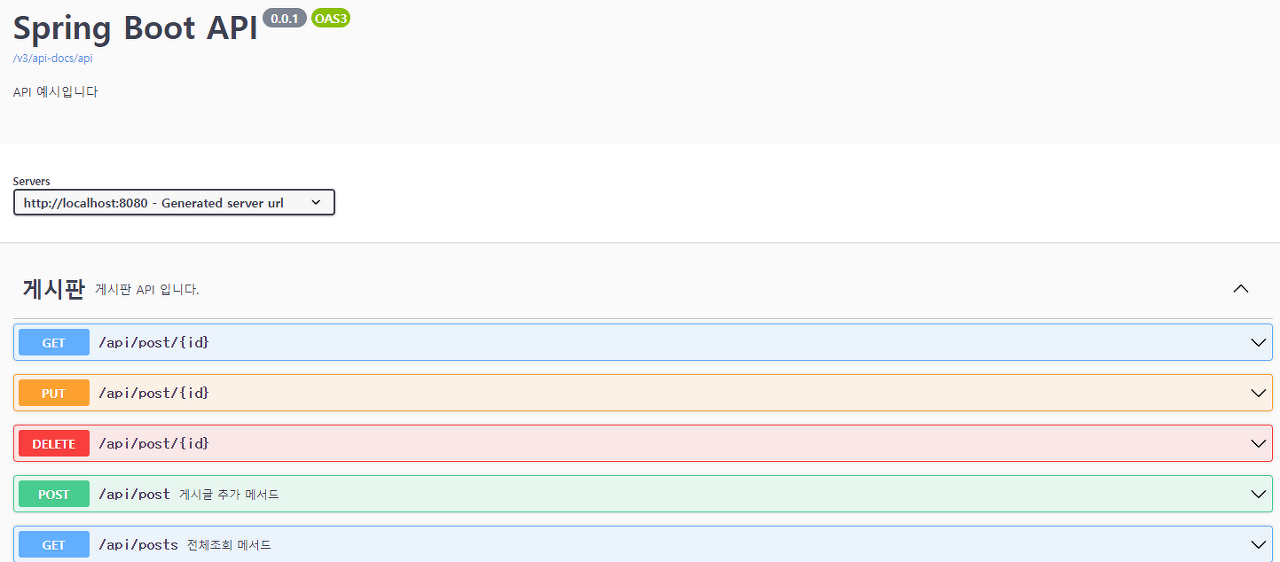 http://localhost:8080/swagger-ui/index.html에 접속해보면 다음과 같은 화면을 볼 수 있다.