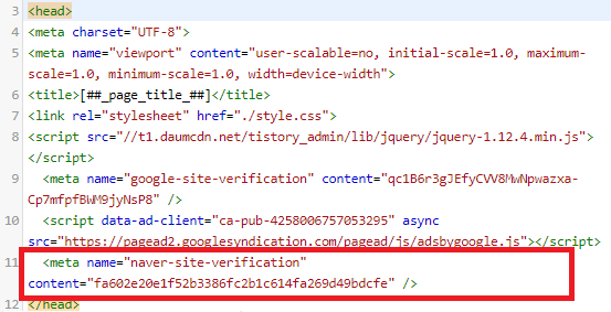 6. HEAD부분에 복사한 코드를 집어넣는다