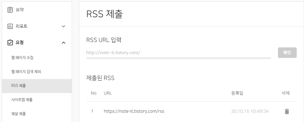 요청 - RSS 제출 - RSS URL 입력 -https://티스토리주소/rss